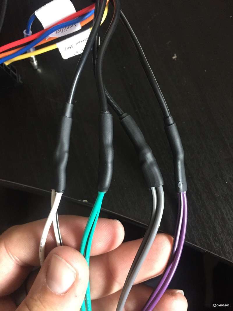 cs2000 Posted April 16, 2016 Posted April 16, 2016 (edited) Hey all, I recently fitted a new headunit and was aware of a low volume output issue that seems to affect most aftermarket headunits due to the Bose setup in the Z. I managed to figure out busters instructions for fixing this and have been running this setup in my car for a couple of week now with no issues at all, other have been running this for much much longer. Busters instructions aren't too good however and several members have been calling for a 'proper' guide, so here we go . I will say again, I did NOT figure this method out, the credit for this goes to Buster and his original topic viewable below, I am just writing up a guide for his method. I have made one small amendment however by adding in an extra connector which saves you hacking into your new headunits harness. http://www.350z-uk.com/topic/58947-reduced-sound-out-put-after-replacing-oe-bose/ Parts & Tools Required 1x Autoleads PC2-76-4 Nissan 350Z 2003 - 2006 Car Stereo ISO Harness Adaptor Lead £3.85 http://www.ebay.co.uk/itm/261373114757 1 x Nissan 350z Bose Steering control interface - (29-674) £34.99 https://incartec.co.uk/Pages/Product.aspx?P=2975 Soldering Iron & Solder Heat shrink in 2.4mm, 3.2mm and 4.8mm widths with 3:1 shrink ratio Scissors Wire Strippers Multimeter (Optional but recommended) Hack 'n' Slash OK, firstly, grab hold of your Autoleads PC2-76-4 adaptor cable. This is the type of cable used on cars that don't have the bose system, but for our use, we will just be stealing the brown speaker connector. All we need on this is the brown connector and its associated leads. If you look at the writing on the side of them, you will notice each one is printed with a speaker such as "Left Front Pos" and "Left Front Neg". Take your scissors and cut this off. Discard the other piece, just keep this bit. http://i.dankdronedownloader.com/uploads/2020-08/5MZDMb.jpeg Next, grab the InCarTec 29-674 lead and your scissors and cut off the RCA connectors below the gland as shown here. Preparation OK, enough cutting, now into something constructive. Strip the cable ends you have just cut on the InCarTec 29-674 cable, you will see a outside wire, some more insulation and an inside wire. Separate these so that all of the outside wires point off at 90 degrees, then strip the innards too. Now, get your 2.4mm heatshrink and cut 8 lengths of 1 cm, slide them over the wires on the brown connector you cut from the Autoleads PC2-76-4 connector as shown below. Next, grab the 3.2 and 4.8mm heatshrink, cut these into 4 lots 1cm and 2cm lengths respectively and slide these over the wires on the InCarTec 29-674 cable so one fits just inside the other as shown. You should now be able to see that the wire colours between the two harnesses actually match! Purple is Right Rear, Grey is Right Front, White is Left Front and Green is Left Rear. Constructing the Cable OK, so you now need to connect the first of the 8 leads together. Lets begin with purple. The purple lead with no stripe is the Positive connection for the speaker, you need to twist this together with the centre purple cable on the InCarTec 29-674 cable as shown in the bottom of this cable. Then twist the one with the black stripe to the wire that was wrapped around the outside of this purple cable, shown at the top here. Solder these together trying to use as little as you need, then use scissors to cut off the extra bits. When you have soldered these, we now need to insulate the positive and negative connections, so, slide the 2.4mm heatshrink up from the brown connector end over the positive connection you just soldered, heat this up and ensure it covers the joint. Next, slide down the 3.2mm heatshrink over the negative end as much as possible, this may be tight, but this bit isn't 100% essential. Lastly, slide over the larger 4.8mm bit to cover the entire lot up, you have now insulated the Pos from the Neg, and secured the whole lot together. Its a simple case of repeating this fro the other 3 wire colours so your cable looks like the below. Check Your Work!!! Your cable is now electrically connected, but id HEAVILLY advise you to check you have connected things properly. This is where your multimeter comes in, set this to continuity. If you grab the brown connector, you should see 8 pins at the end. Follow these back and you can easily tell which cable connects to which pin. The image below shows the two white connectors, on top of my finger you can see the pairs of cable (White & Black, Grey & Black, Green & Black, Purple & Black going left to right). These colours should match from end to end. I would advise you con connect your multimeter between these ends and check continuity between them. i.e, stick one end in the purple leads pin on the brown connector end, then touch the other end on the purple cable pin on the white connector, it should bleep to indicate there is a connection between the two ends. Then move to the black cable on the white connector, and the purple and black striped cable on the other end. Its hard to explain, but its simple with the cable infront of you! Completed Cable So, now your connections are completed, il just run through what goes where when you come to connect this up in your car. And here is the rear of the Bose headunit The Red circled cable is for the steering wheel controls. This plugs into the connector in the bottom left of the Bose photo. The two Green circles cables plug into the other two white connectors in the back of the Bose unit. These are TOTALLY different sizes, so you physically cannot plug these in wrong! The two Blue circled plugs connect to the corresponding plugs on your headunits harness adaptor, this will usually be a big black connector as shown below. You need to take care here as the brown block has all 8 pins, but the black one only has 5. This matches the pin count in the black block connector too (5 on the top and 8 on the bottom) That's it, your lea